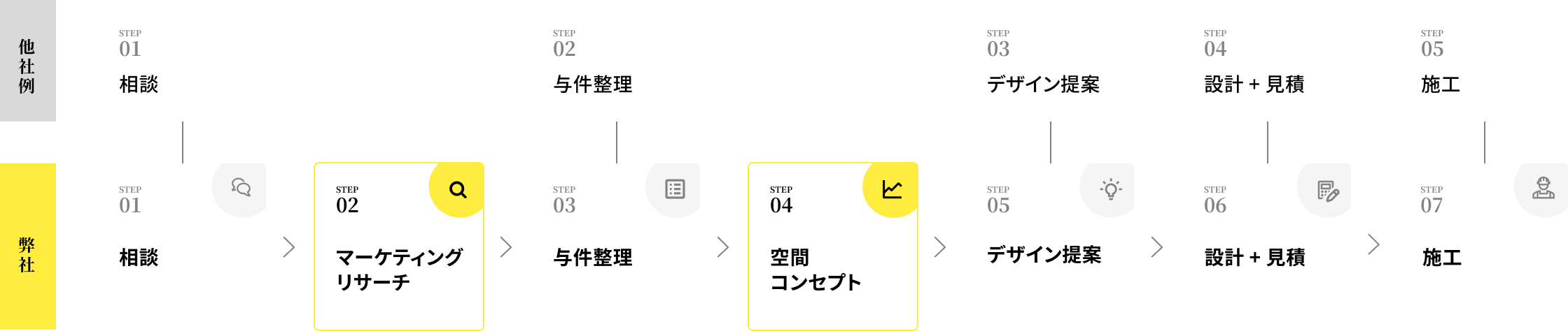 わたしたちは、デザイン業務だけに留まらず、 マーケティング戦略・マネージメント・コンストラクションまで空間を作る一連の行為をサポートします。